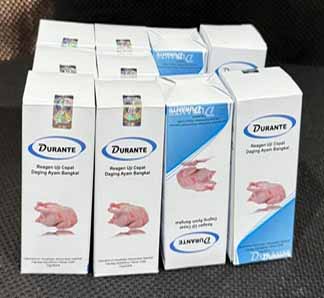 ALAT UJI AYAM TIREN DIGUNAKAN UNTUK MENDETEKSI AYAM YANG SUDAH MATI DAN MASIH TETAP DIOLAH DAN DIMASAK, KEMASAN 150 TEST CARA PEMAKAIAN : 1. Buat extrak daging 1.1 g/ml 2. ambil 1 ml ektrak daging 3. Tambahkan 1 - 2 tetes Durante Pembacaan Hasilnya : Hijau (+) daging bangkai Biru (-) bukan daging bangkai